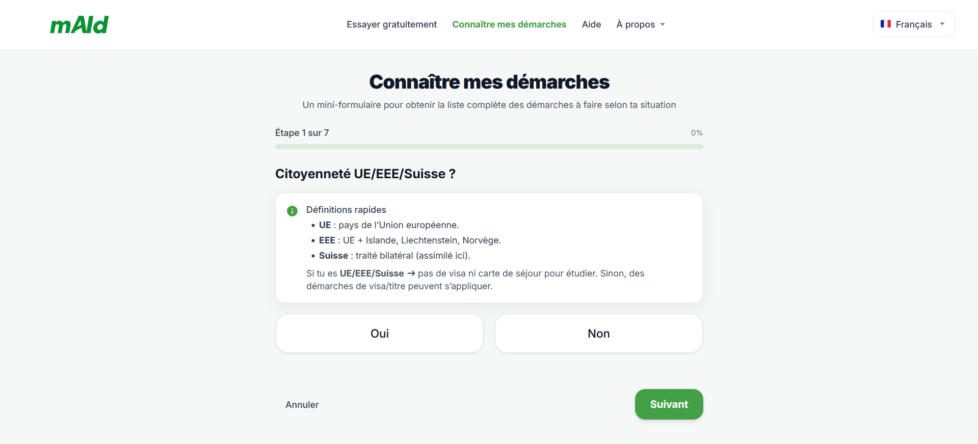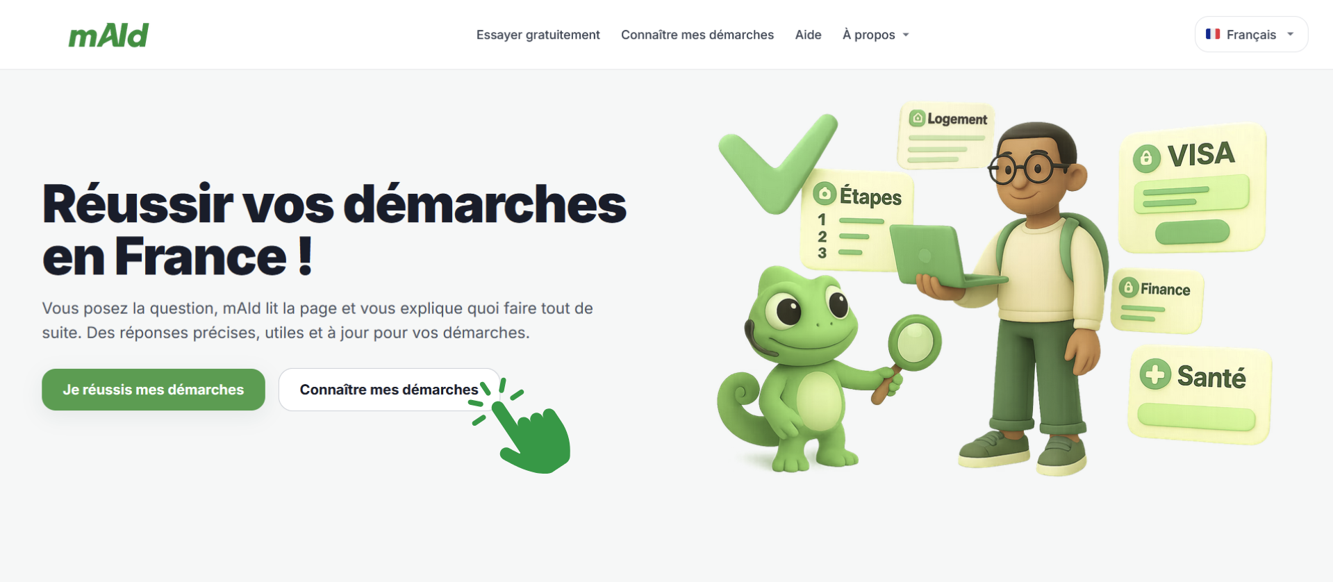 - Rendez-vous sur le site de mAId et lancez le questionnaire rapide accessible via le bouton "connaitre mes demarches"